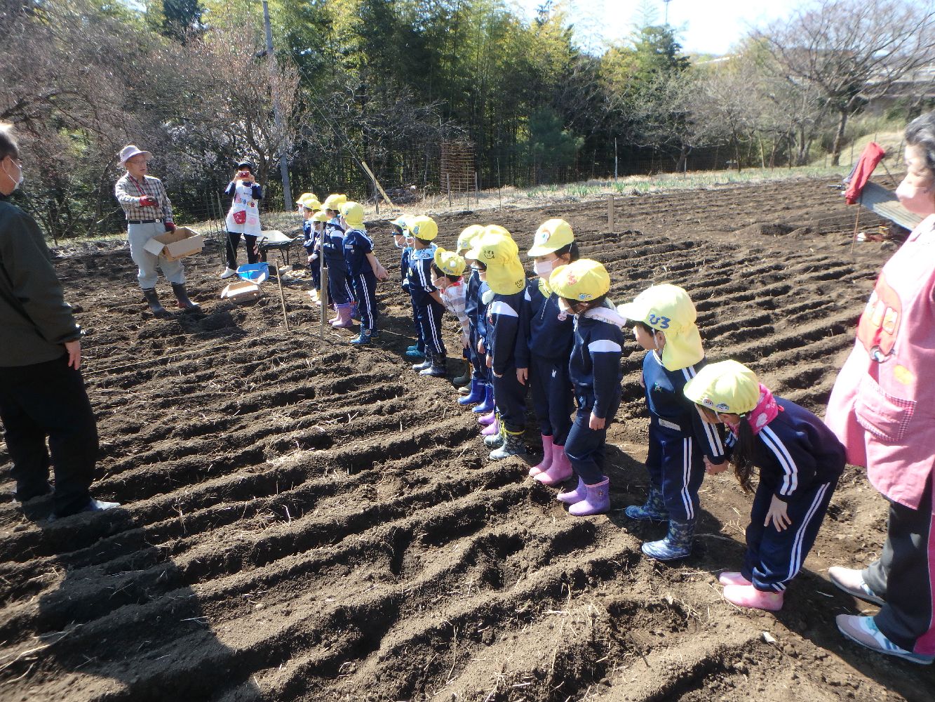 中村先生の御挨拶と植え方の説明の後、一列に並んでジャガイモを植えました。