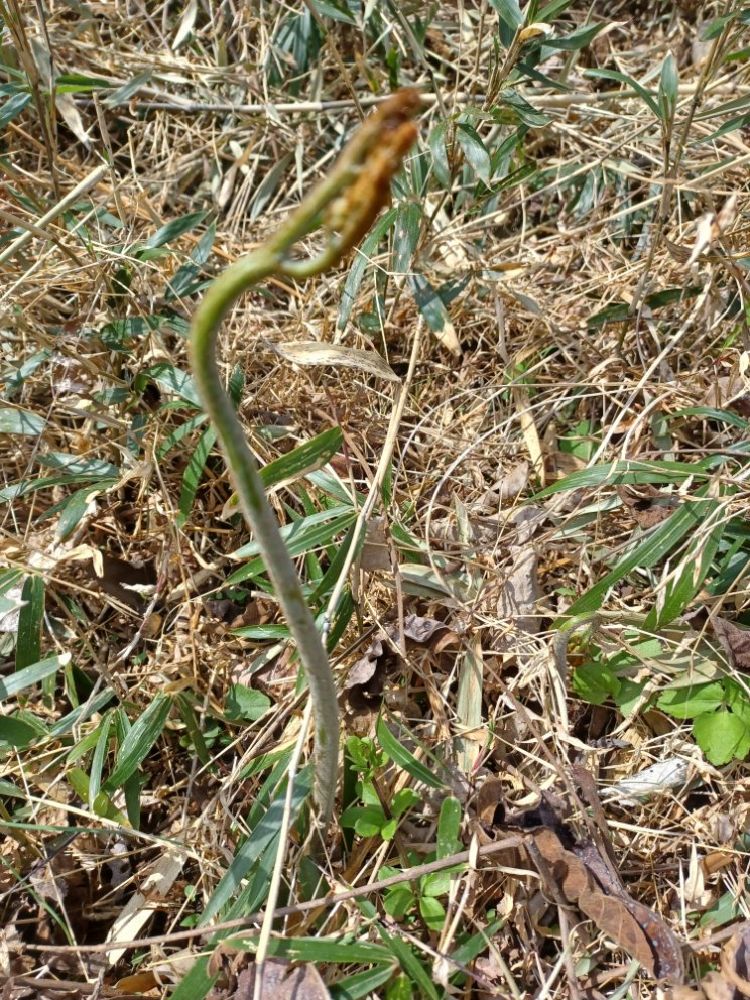 竹藪の中に、意図も不思議な形と色をした物体(キノコ?)を発見。