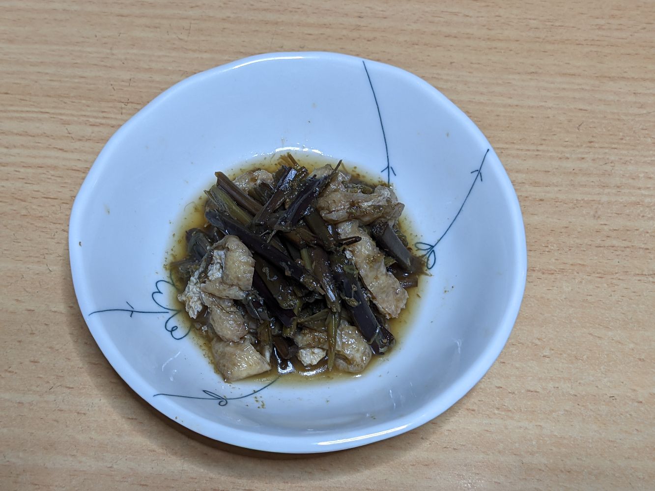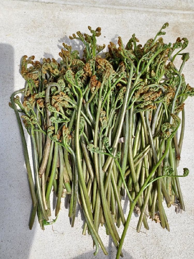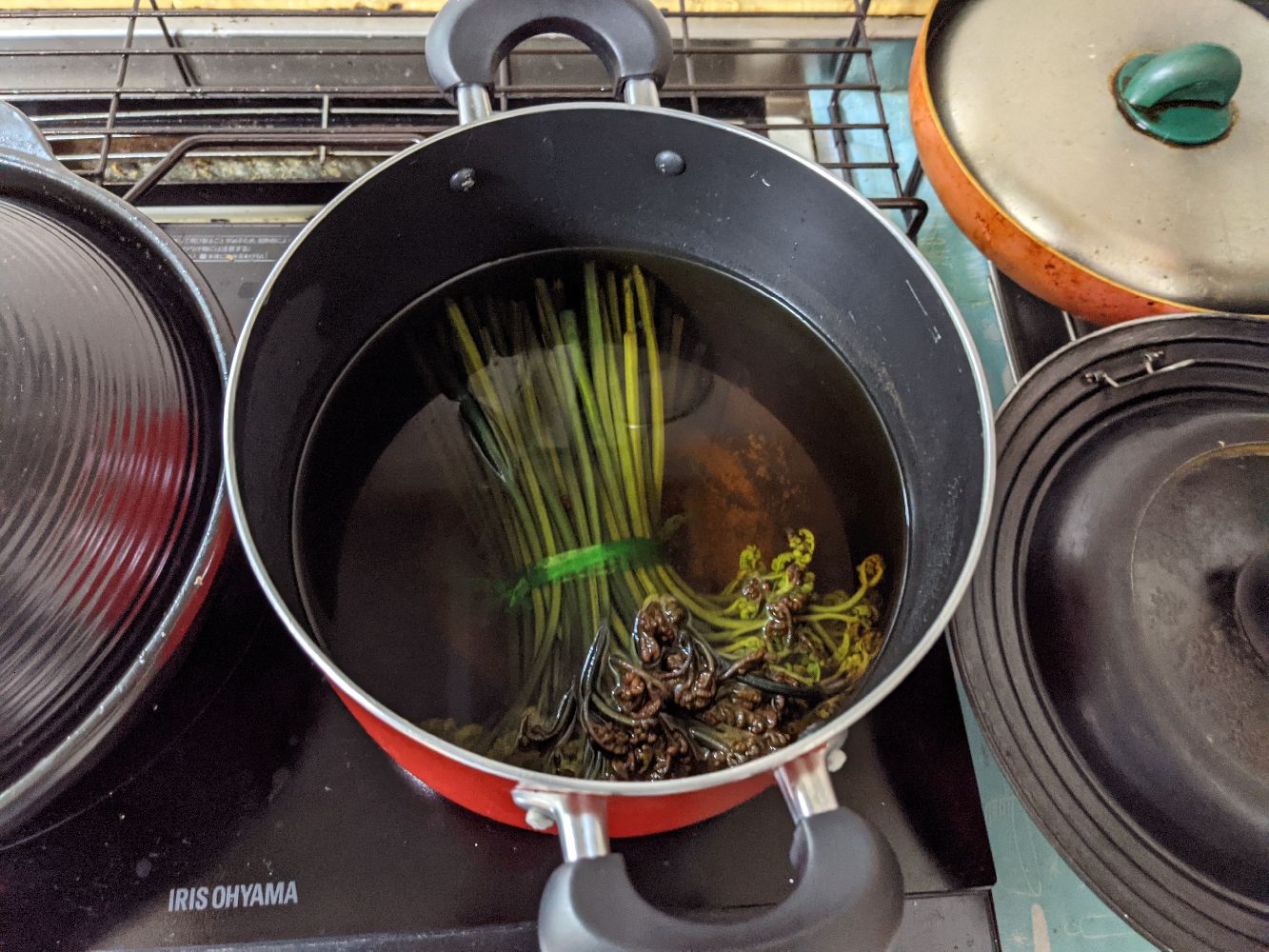 重曹水に一晩浸けてわらびのあく抜きをします。