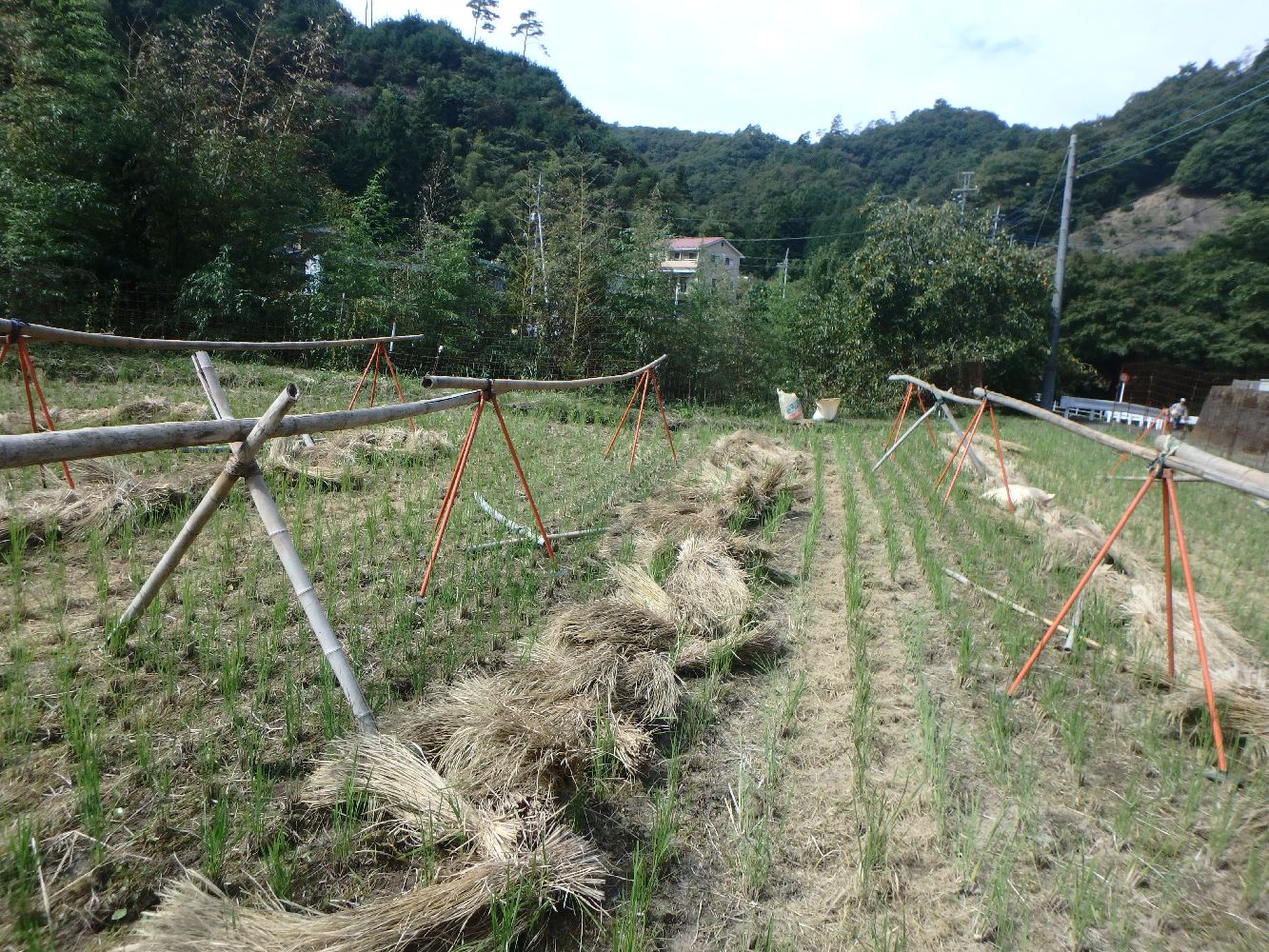 刈り取った稲をウシ(干す竿)に掛けて干す作業も併せて行いました。
