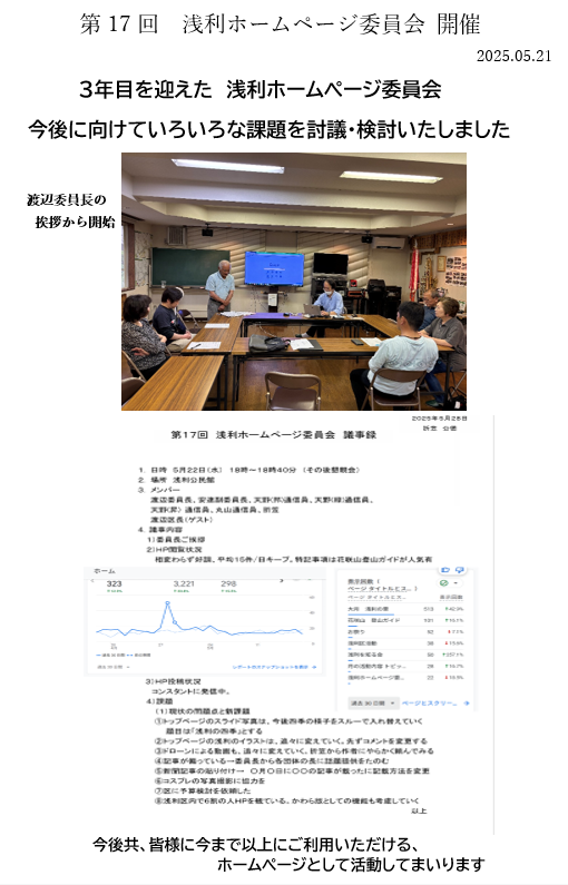 また、運営に当りましては、安達副委員長「副区長」、技術担当の折笠様「分館長」をはじめ「ホ−ムページ浅利の里通信員」6名(下組・上平組・入組各2名)の皆様方が携わり、身近な情報や四季折々の便りを投稿していただきました。近年、災害が全国で多発しております。安心して暮らせるよう、これからもお役に立てる情報発信を続けて参りたいと思います。