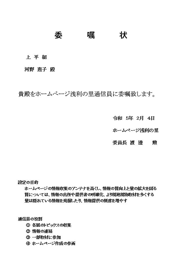 ホームぺージ「大月 浅利の里」通信員委嘱式 開催