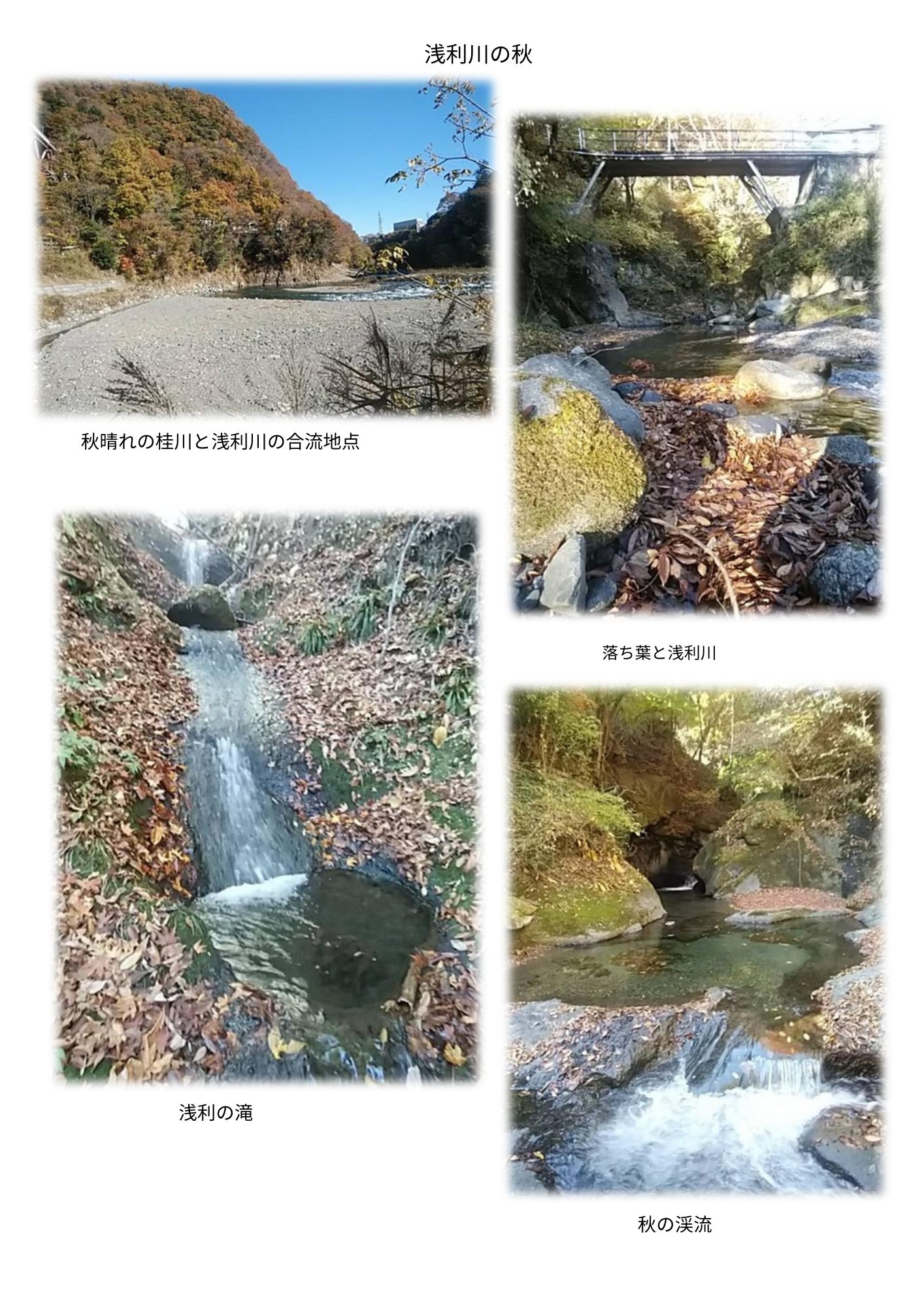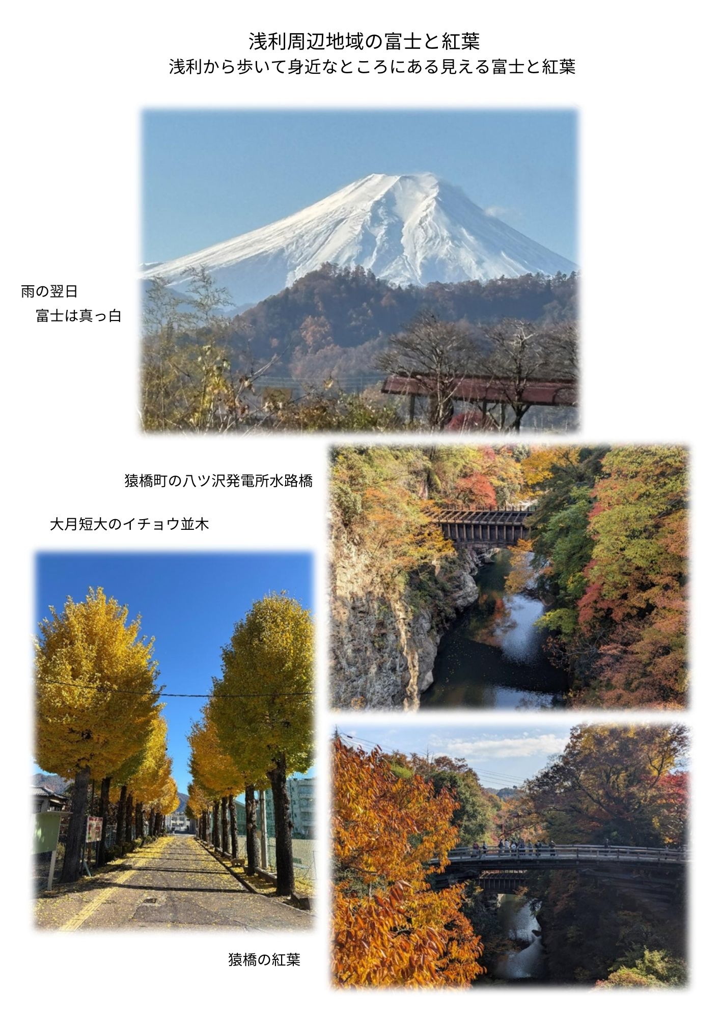浅利川のせせらぎに寄り添う落葉や、佇む与一地蔵、そして雪化粧した富士の姿が、