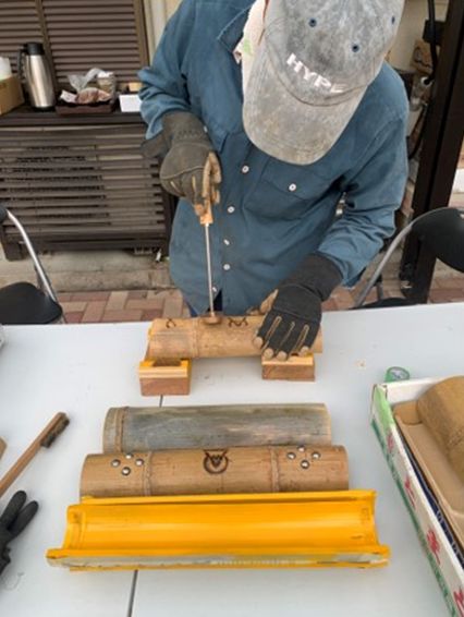 竹にドリルで穴をあけていく作業ですが、先ずは安全第一、そして楽しく・・・・