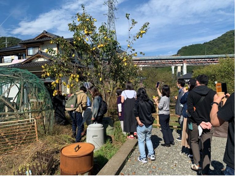地元産のカリンもぎ取り体験するツアー参加者