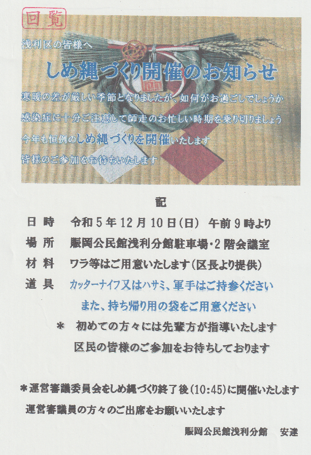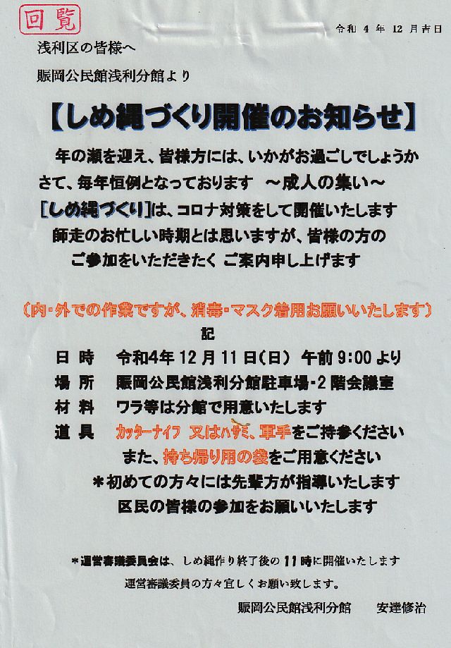 浅利分館『しめ縄づくり』が好天の12月10日(日)に行われました。