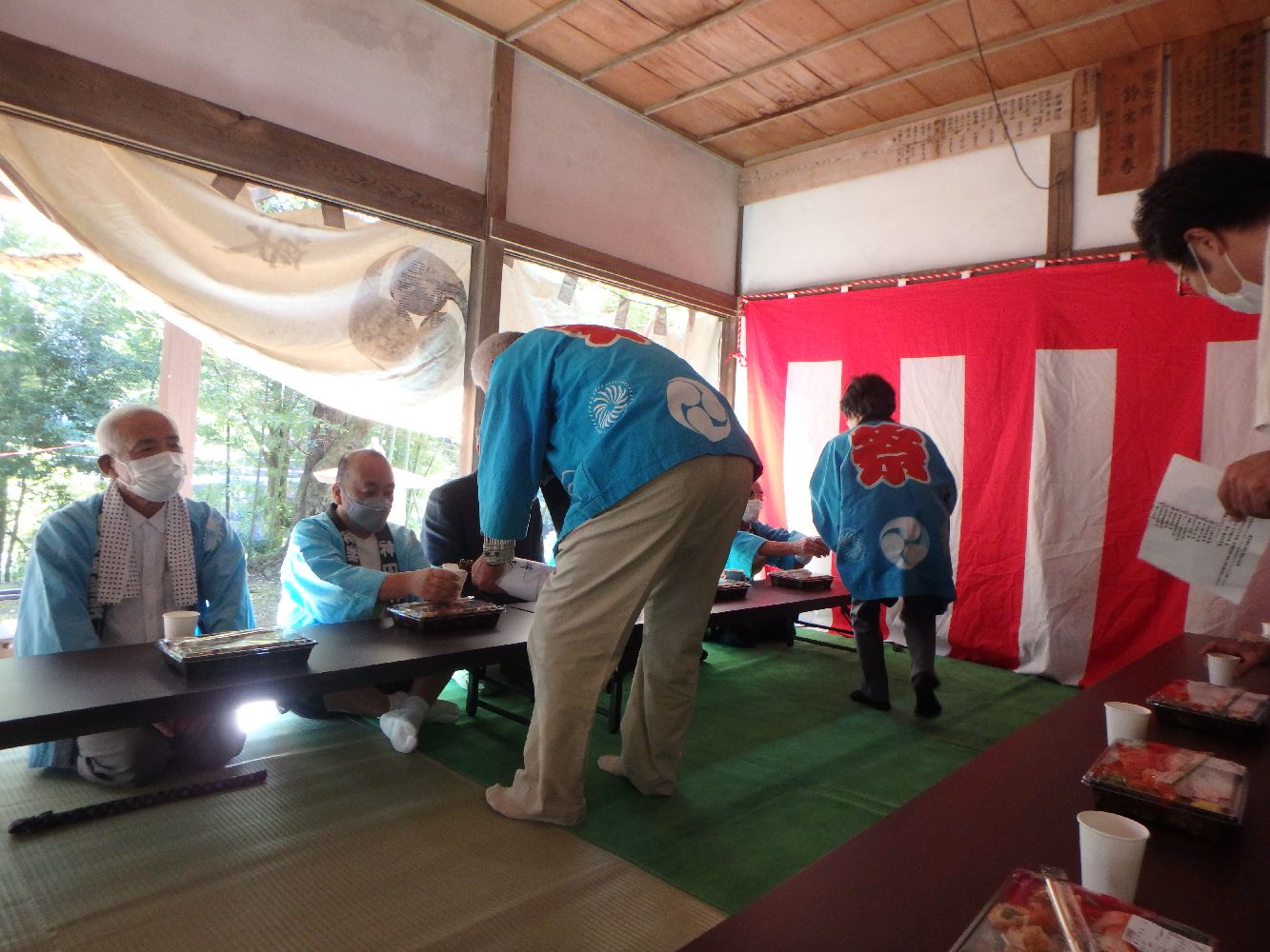 祭り総代完了のXピースとそれを見守る氏子