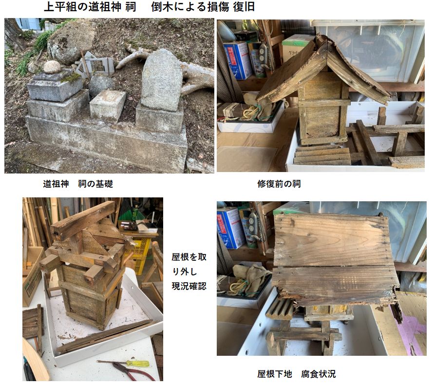 上平組さかえ屋(屋号)さん近くの道祖神の祠が倒木による損傷してしまい、