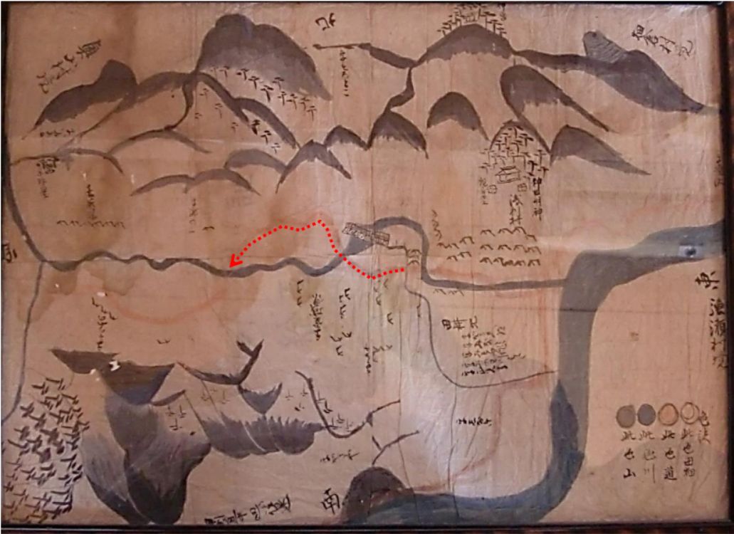 調査のルートは、下図に示す浅利村の古絵図に基づき、赤い矢印で示した和出橋を渡った坂を上り切った