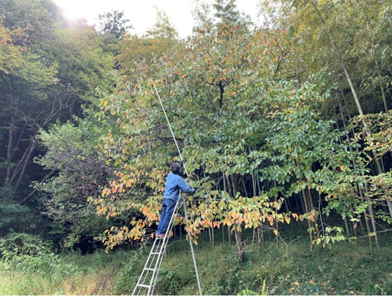 積み上げられた薪や残り柿の風情に、去りゆく季節への愛惜と里山の哀愁が深く滲む、